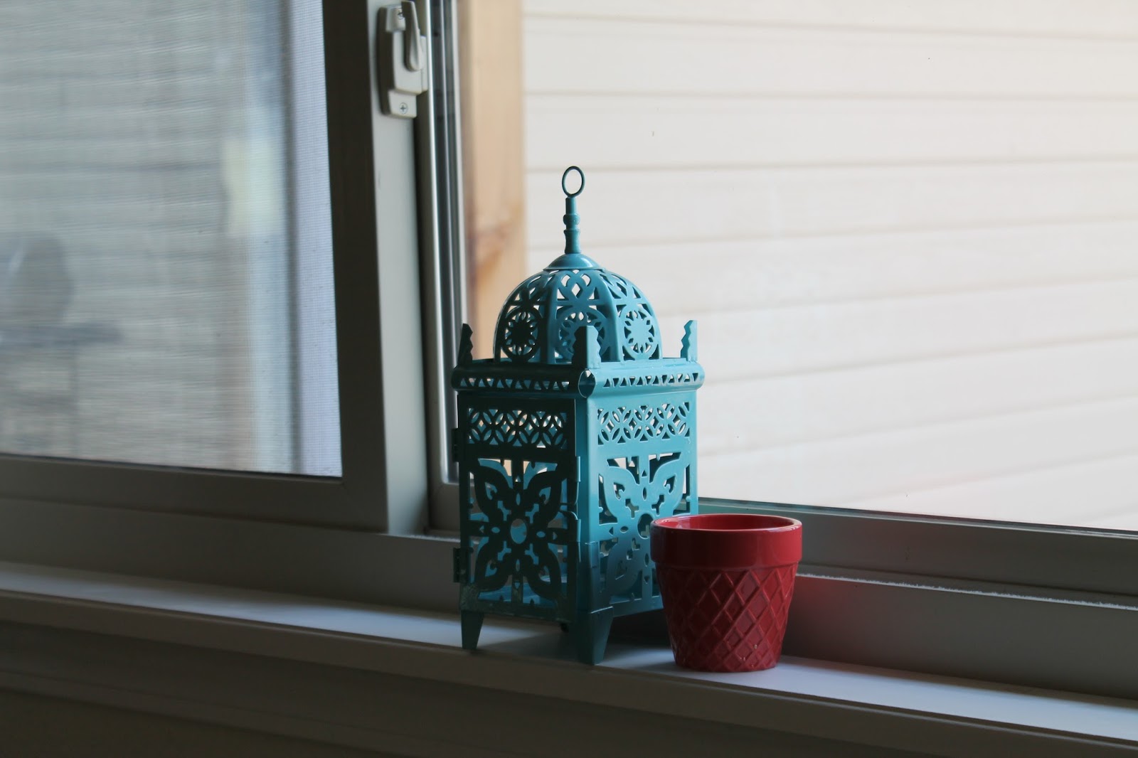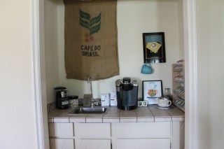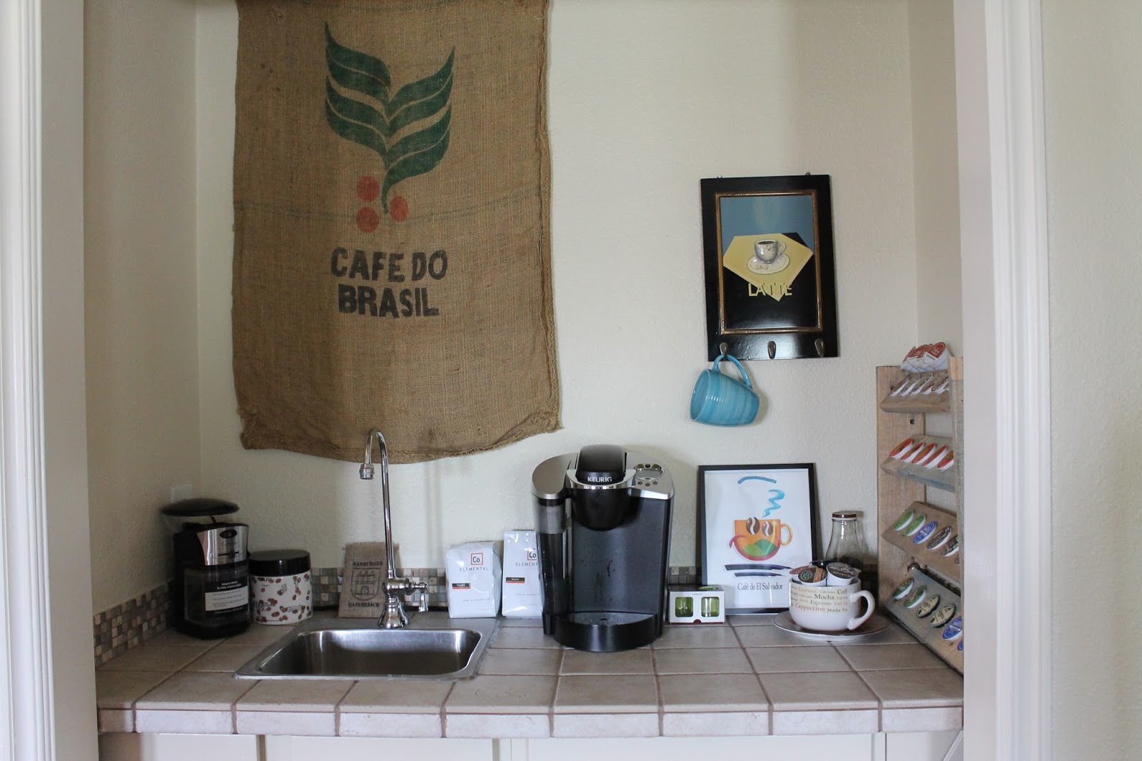 In here we painted walls and trim, tiled the countertop and backsplash, and painted the cabinets. Marcos made the k-cup holder out of a scrap pallet we had. I framed a souvenir bag we had brought home from El Salvador which has a special place in our hearts. And of course the “cafe do Brasil” coffee bean bag was kind of our starting point for this space. We would still like to potentially add some more shelving to get some of the stuff up off the counter but for now its a pretty happy little coffee spot.