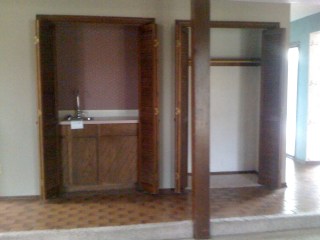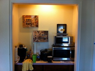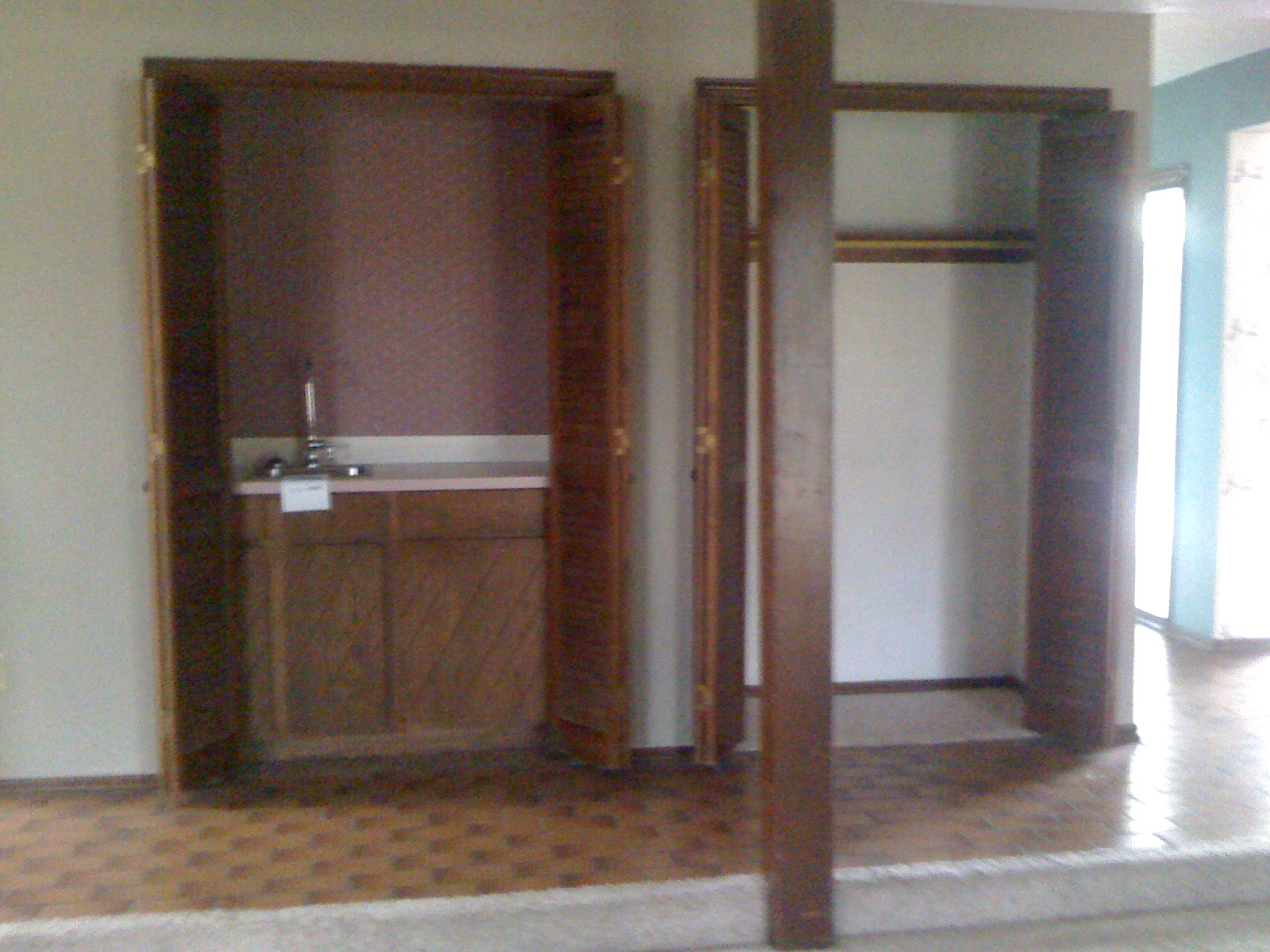 This picture was taken from standing in the living room looking back, with the entry off to the right (look at those blue-green walls!) This was obviously originally intended to be used as a wet bar, a pretty staple feature of many homes built in the 70s. Since we didn’t have any use for that we turned it into a place to store all of my coffee-loving husband’s paraphernalia.