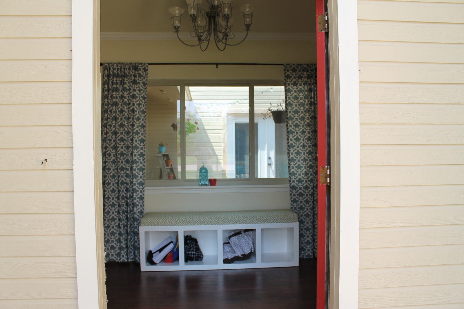 In addition to just being weird, all those glass doors were also horribly inefficient for heating/cooling purposes so one of the first major projects we took on that summer was removing all 3 sets of sliding doors and framing in normal walls/windows. (I’ll show more of the master bedroom details in its own post). In the entry, we opted for a long window and I envisioned a window seat/bench below it from the very beginning. So I am pretty ecstatic that from that same point of view our entry now looks like this!