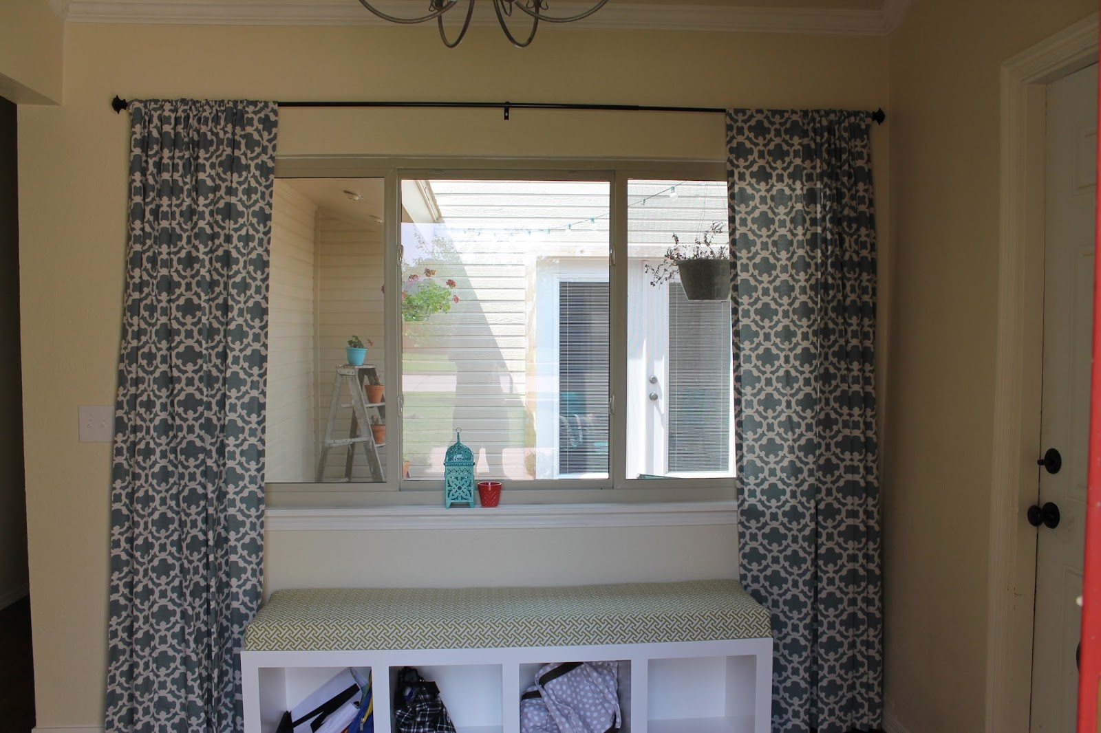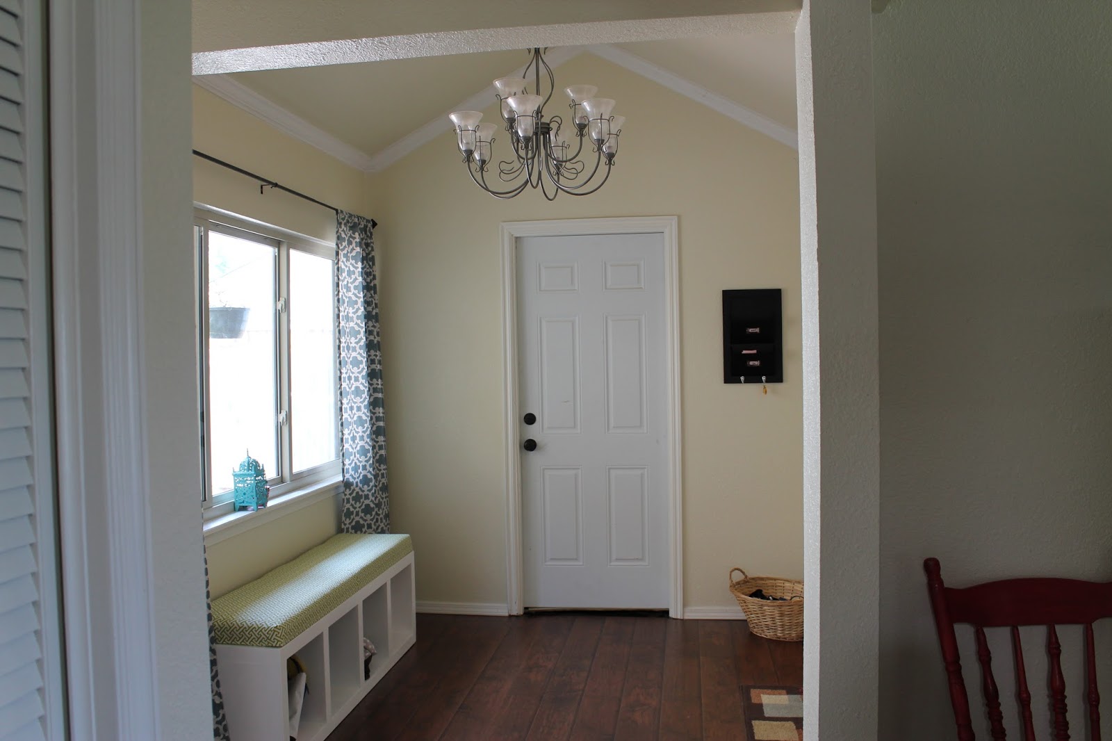 As well as reframing that wall from a door to a window, we also re-textured and painted the walls, painted all the trim, added crown moulding, replaced the door to the garage, installed the wood floors and refinished the front door. The bench was a thrift store find that I refinished and added a cushion to. I’ll post more details about that project soon. The light fixture was original with the house and we decided it wasn’t bad enough to be worth replacing. If we live here long enough maybe somewhere down the line we will but for now we like it enough to live with it. I also hung curtains and added our little mail in/out box. We use that basket in the corner to store flip-flops and everyday shoes that get left by the door.