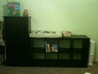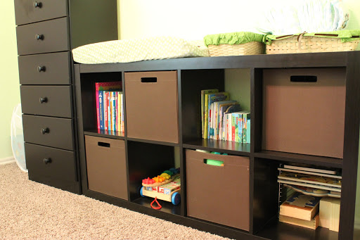 This Expedit bookcase from IKEA was an awesome purchase! It was the only piece of furniture we bought for his room and I am so glad we did! It holds TONS of toys, books and puzzles (when he was little it held burp cloths and onesies) and he can help me clean up his room since it’s on his level.