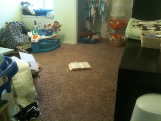 Then it became a storage room and was literally completely full of boxes. Like most the time you couldn’t open the door. Most of the rest of the house wasn’t really livable so lots of our stuff just stayed in boxes in this room. But then we found out that we had a little monkey on the way and I got a vision for this room (and we got REALLY busy!!) We patched holes in the walls, re-textured, painted all the trim and cabinets, painted the walls, replaced light fixtures and outlets and replaced the doors and carpet. So this is it after all the major remodel work but no furniture/decorating.