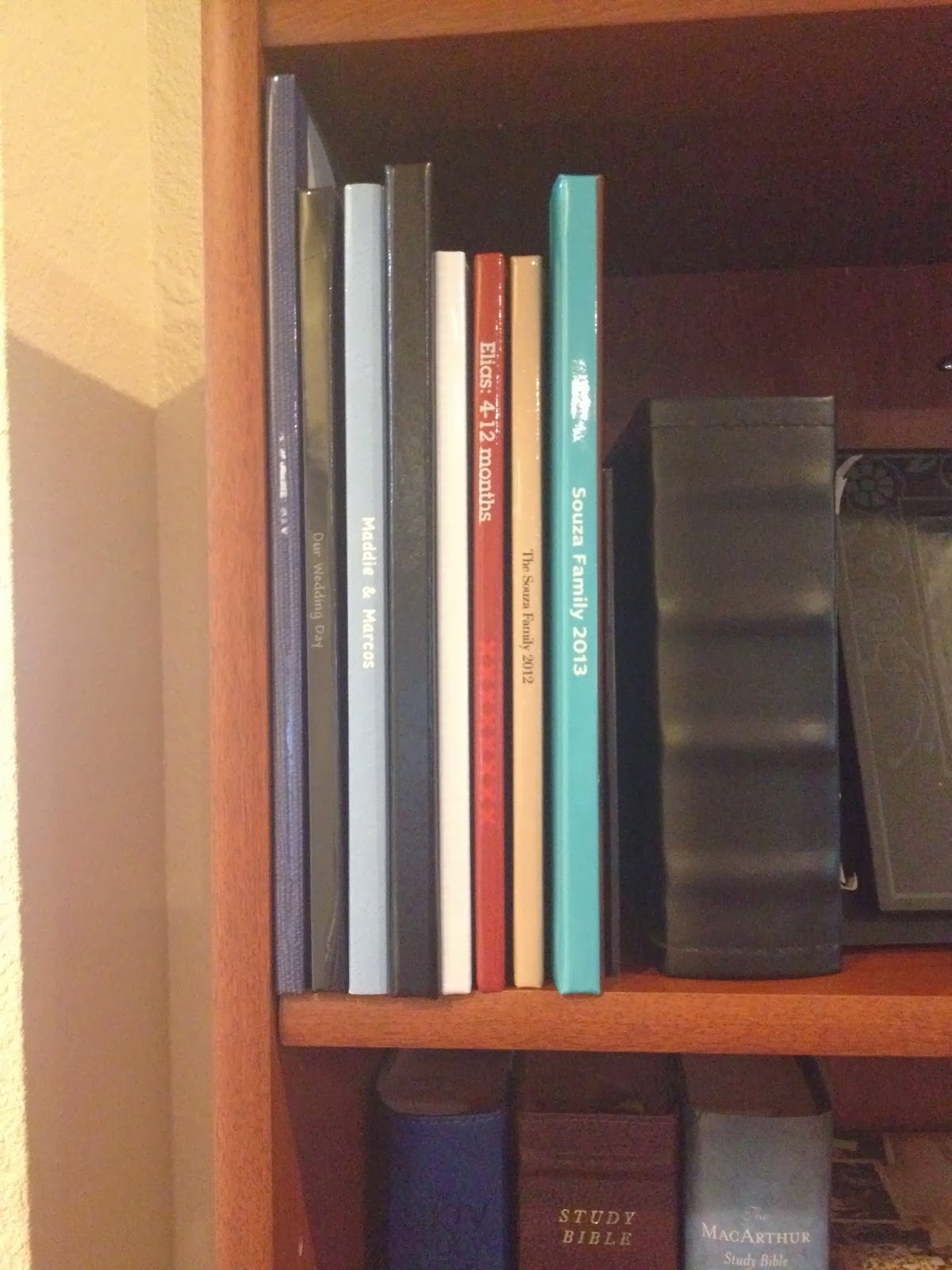 We are beginning to have quite the collection of photo books!. That is the 2013 album there on the end with the teal spine. That is a regular size traditional photo album next to it just to get an idea of width. These things are tiny!