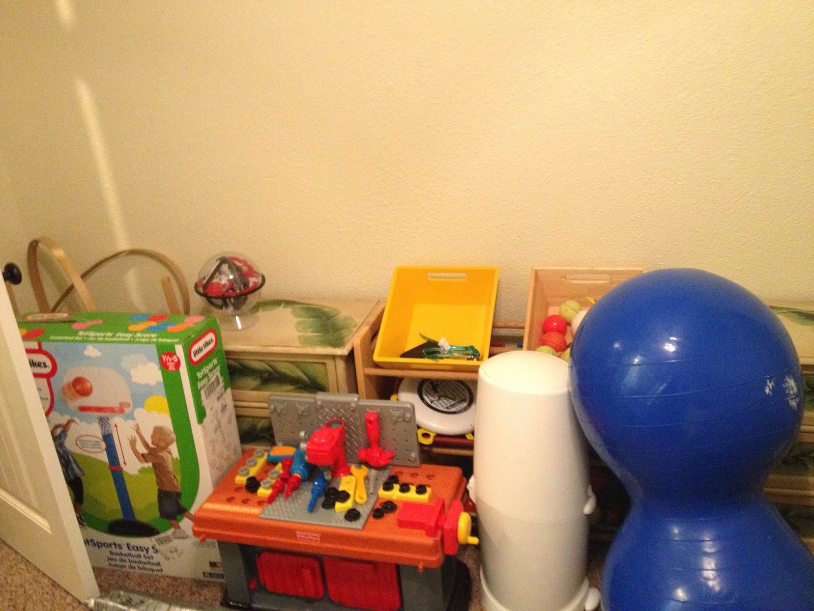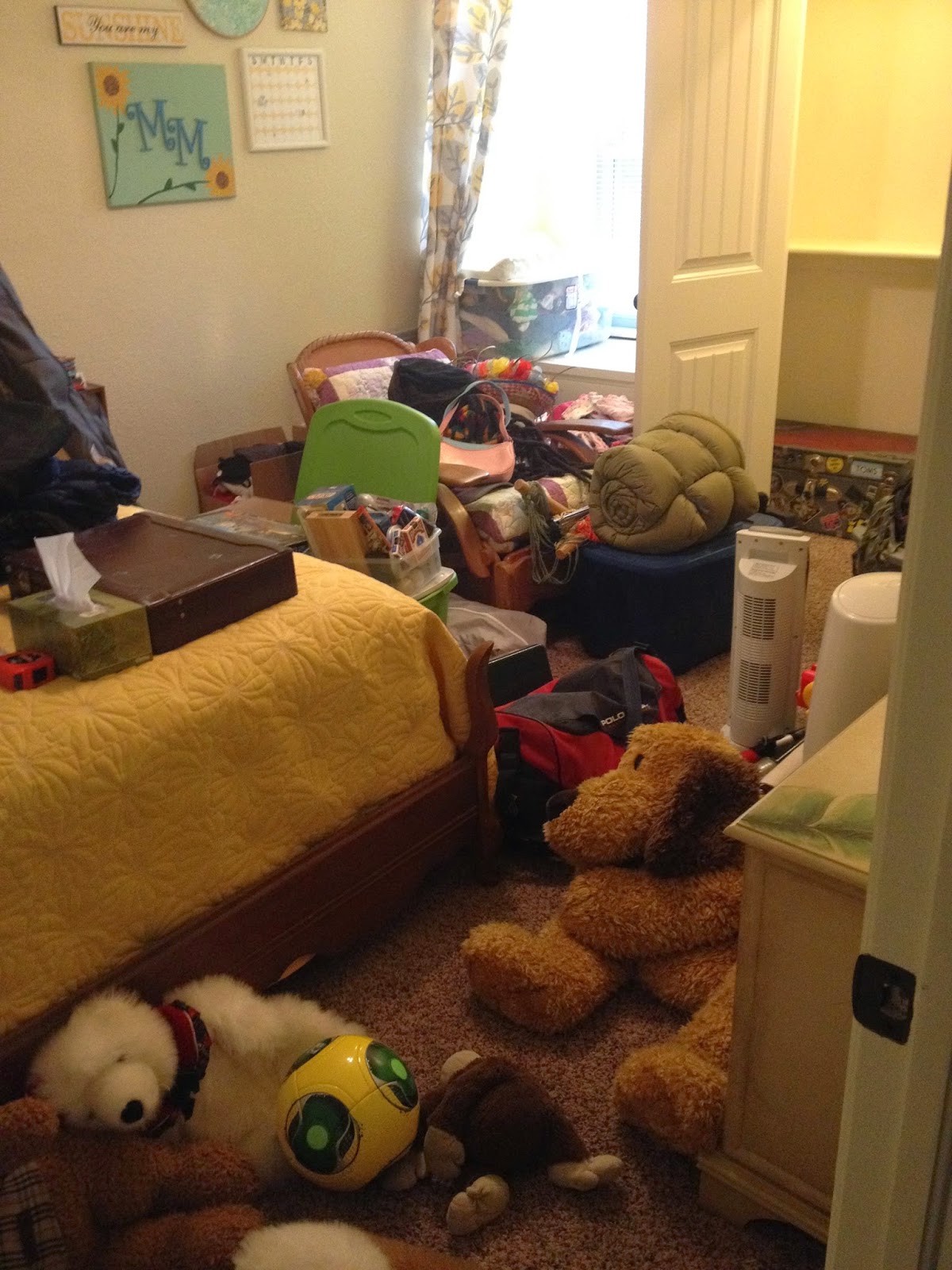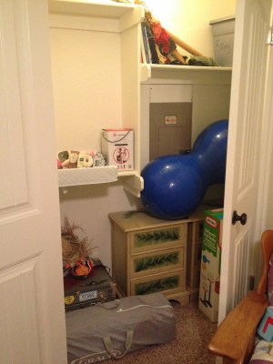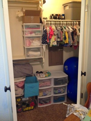 Well at 37 weeks and counting, I finally have a nursery progress post! We have been in a really busy season and I just hadn’t made time to get in there and get to work really until recently. One weekend in March I started going through the piles of stuff “on hold” in there. Like I mentioned in the before and after post, this room has sort of been a holding spot for everything that didn’t really have a home. It also held all of our board game collection, our sports equipment (balls, racquets, etc) along with several tubs of stuff from mine and Marcos’ childhood that didn’t go up in the attic. So there was quite a pile of stuff to go through after I pulled everything out of the closet. I did some of the major purging but the closet was still nowhere close to being baby ready. This is what we started with…