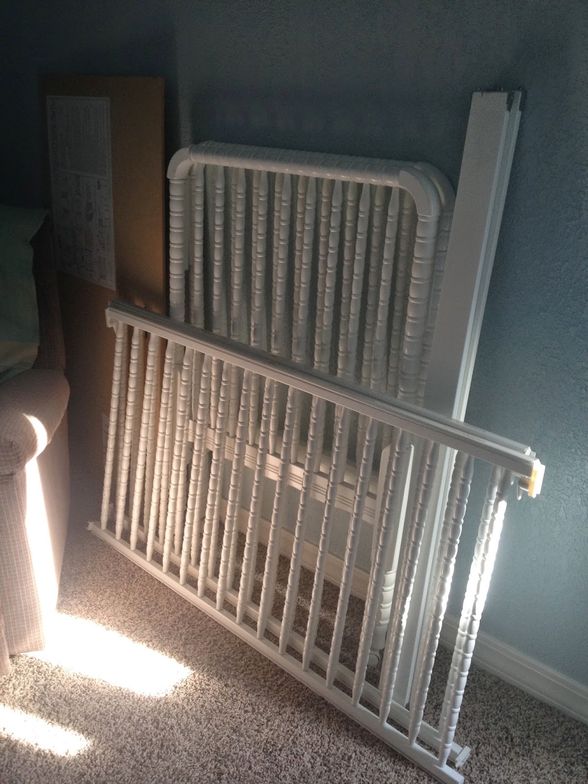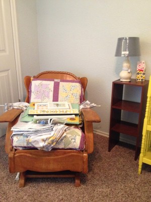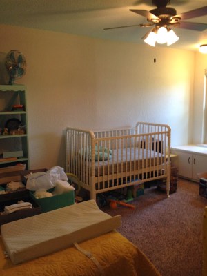 Then over the weekend, my mother-in-law helped with some touch up paint that needed to be done. My MIL is also going to sew the baby’s bedding (which is super exciting!) so we went and picked out fabric for that as well. My awesome hubby hung clothes rods in the closet and curtain rods and also made a jillion trips into the attic to retrieve all the random baby gizmos that have been stored up there since E used them (which I got all washed and assembled). He also sanded and primed the changing table for me and I was able to get two coats of paint on it (it still needs more so I’ll update on that later).