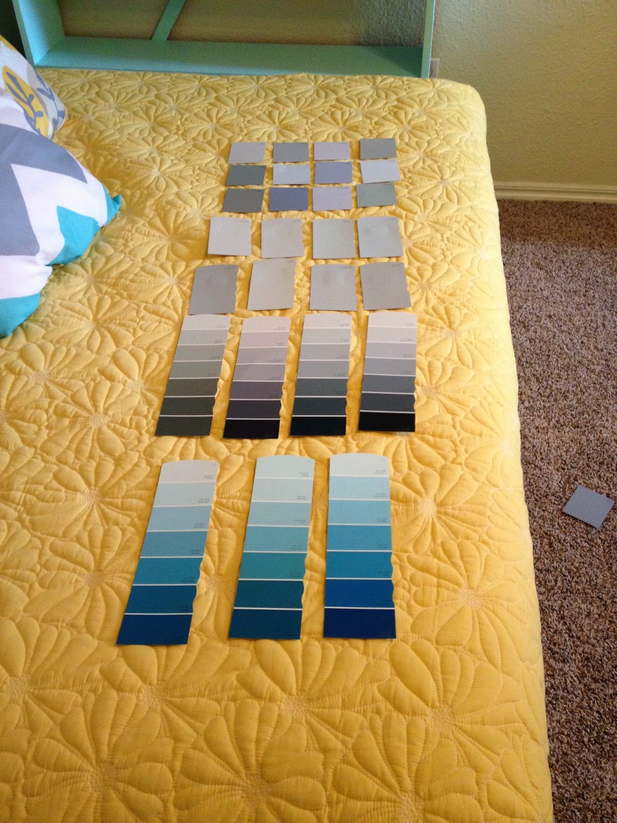 Then came the paint decision which was incredibly hard. Come to find out, a true gray with no undertones that is warm enough without being tan is really hard to find! Especially when the light in this room changes dramatically throughout the day. So I looked at these swatches for literally weeks. We finally decided on a color called Gray Owl for the walls and a light mint for the ceiling.
